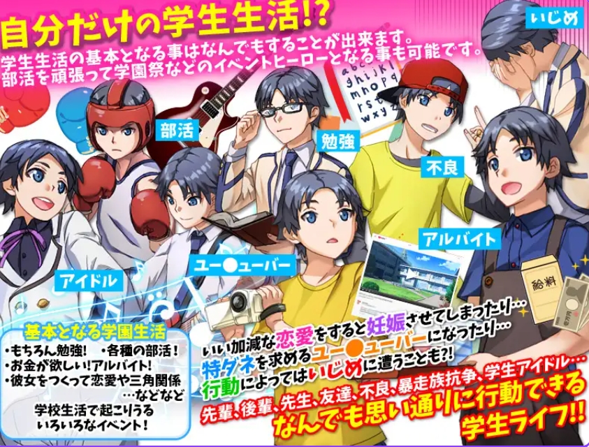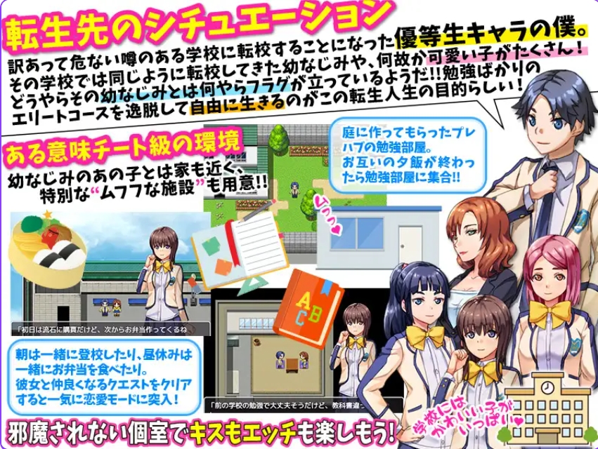 这是一款可以让你作为学生,自由度过桃花朵朵开、后宫预定的转生人生的 RPG 游戏。