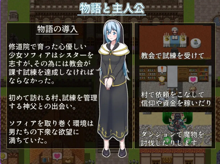 这是一个关于在修道院长大并试图成为修女的少女”索菲亚”在教堂中面临考验的角色扮演游戏。